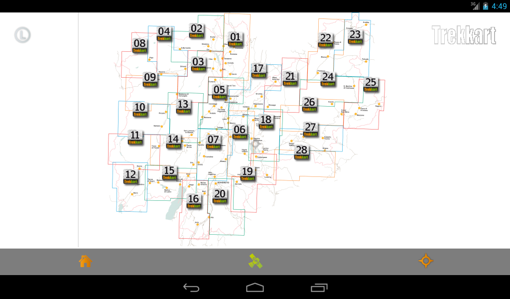 Potenzialmente la nuova app di Trekkart non è male ma c'è da lavorarci su parecchio, secondo me. Si installa senza problemi, almeno sui mio telefono (Acer 370) su scheda esterna (a differenza di Climbalone che dice di incontrare difficoltà). L'interfaccia mi lascia un po' perplesso, non tanto per la grafica gradevole, ma perché poco intuitiva. Dopo la schermata principale e scegliendo le mappe appaiono i numeri della cartine, che sono più estese delle mappe di carta (cosa giusta, visto che il formato tascabile fisico avrebbe poco senso su una app), zoomando si può scegliere quale scaricare. Si scarica rapidamente e senza problemi (via wifi). Il problema è quando si apre l'app la seconda volta. Si rivedono i numeri delle cartine ma non c'è modo di capire quali sono le carte scaricate e quali mancano, perché appaiono tutte uguali. E non è detto che uno si ricordi quali ha scaricato.